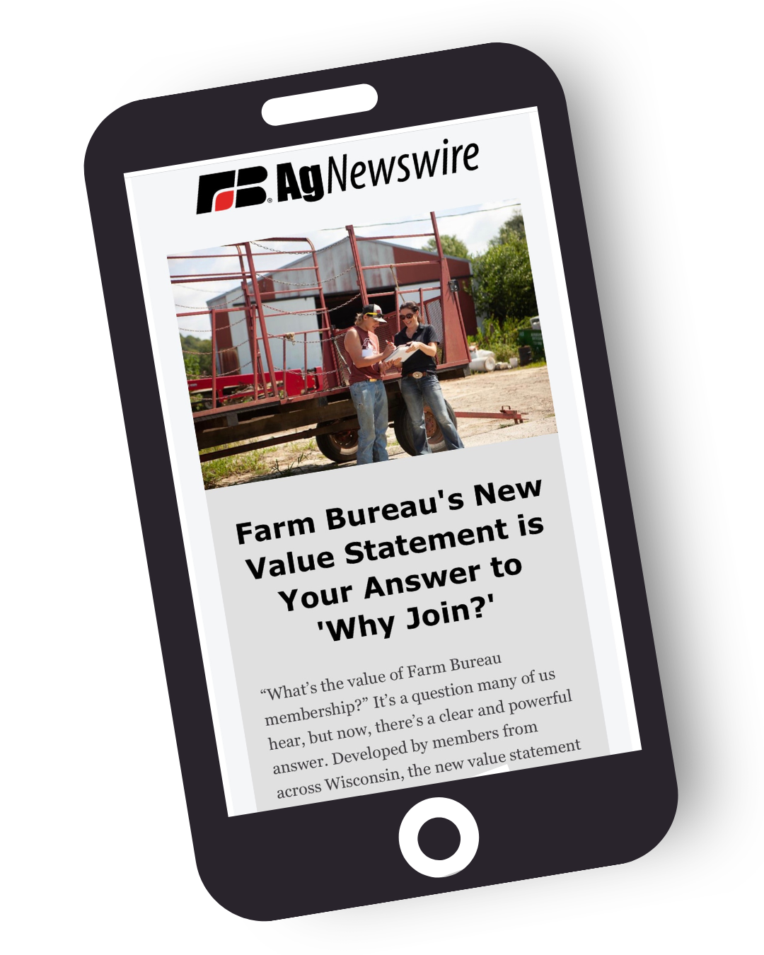 Ag Newswire is a weekly email newsletter that includes Farm Bureau, political and other major ag-related news stories. When you sign up, you will receive an email each Friday with the most recent agriculture news so you are up-to-date with Farm Bureau and Wisconsin agriculture. Ag Newswire is a free resource for anyone who wants to stay up-to-date on the latest agricultural news. Sign up today!